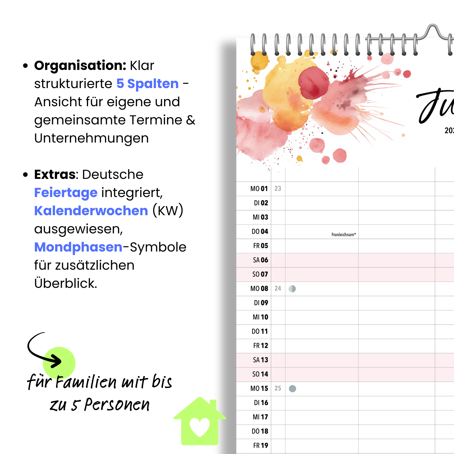 Kunstvoll und individuell – der Familienplaner Happy Splash 2026 vereint Organisation und Ästhetik. Mit künsterlischen Aquarellillustrationen sorgt er für frische Akzente an deiner Wand, ein ganzes Jahr lang.